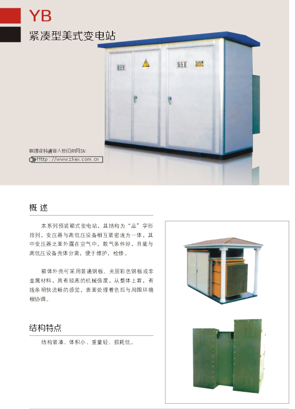 本系列預裝箱式變電站,其結構為“品”字形.排列,變壓器與高低壓設備相互緊密連為一體,其中變壓器之面外露在空氣中,散氣條件好,且能與高低壓設備殼體分離,便于維護,檢修。箱體外殼可采用普通鋼板、夾層彩色鋼板或非金屬材料。具有較高的機械強度,從整體上看,有線條明快流暢的感覺,表面處理著色后與周圍環(huán)境相協(xié)調(diào)。